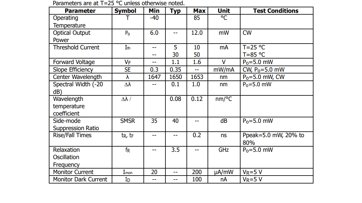 The DFB-1650-T5-6-A-A-A of Multi-Quantum Well (MQW) Distributed Feedback (DFB) lasers are well suited for low-cost high-speed transmitters.